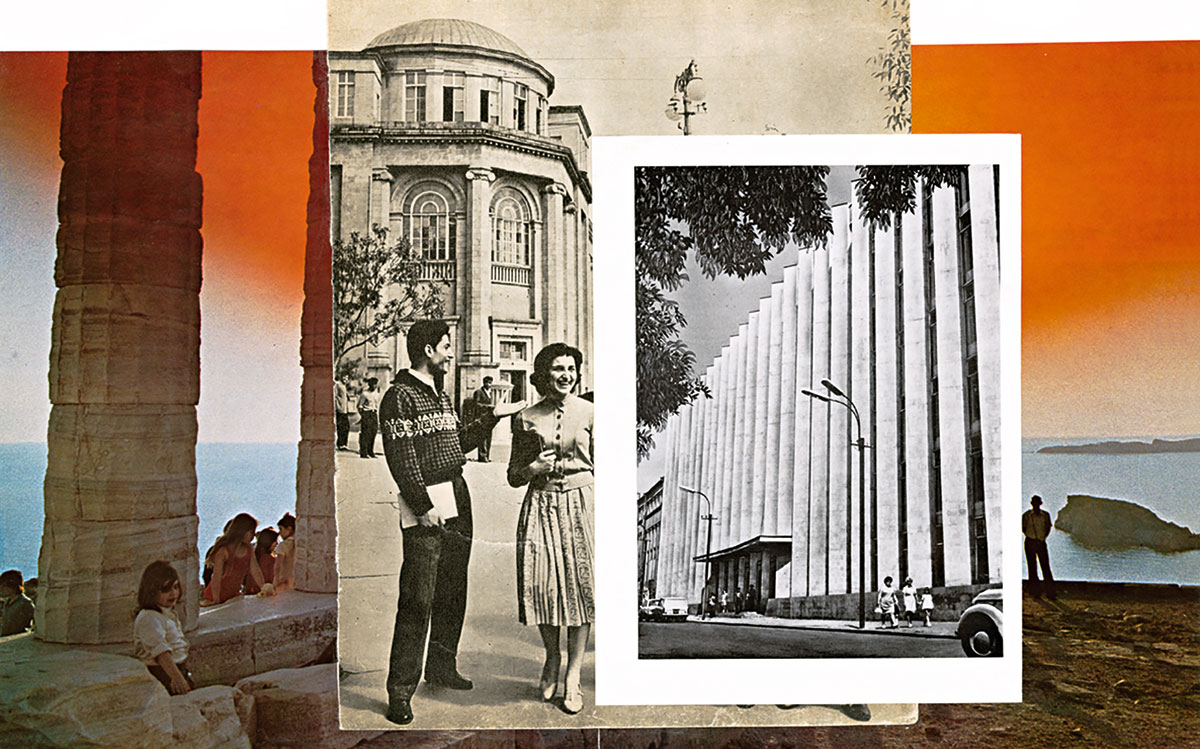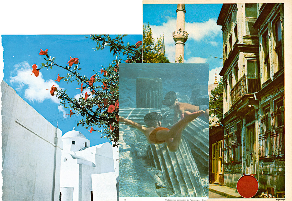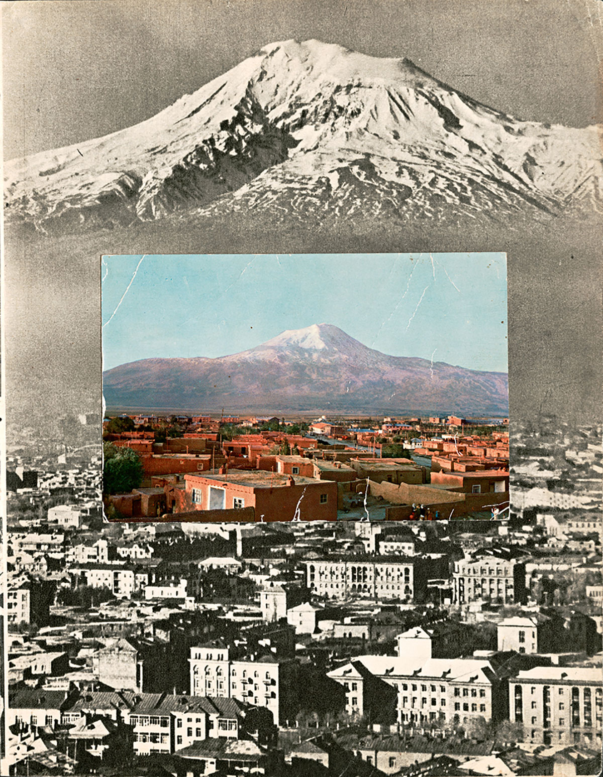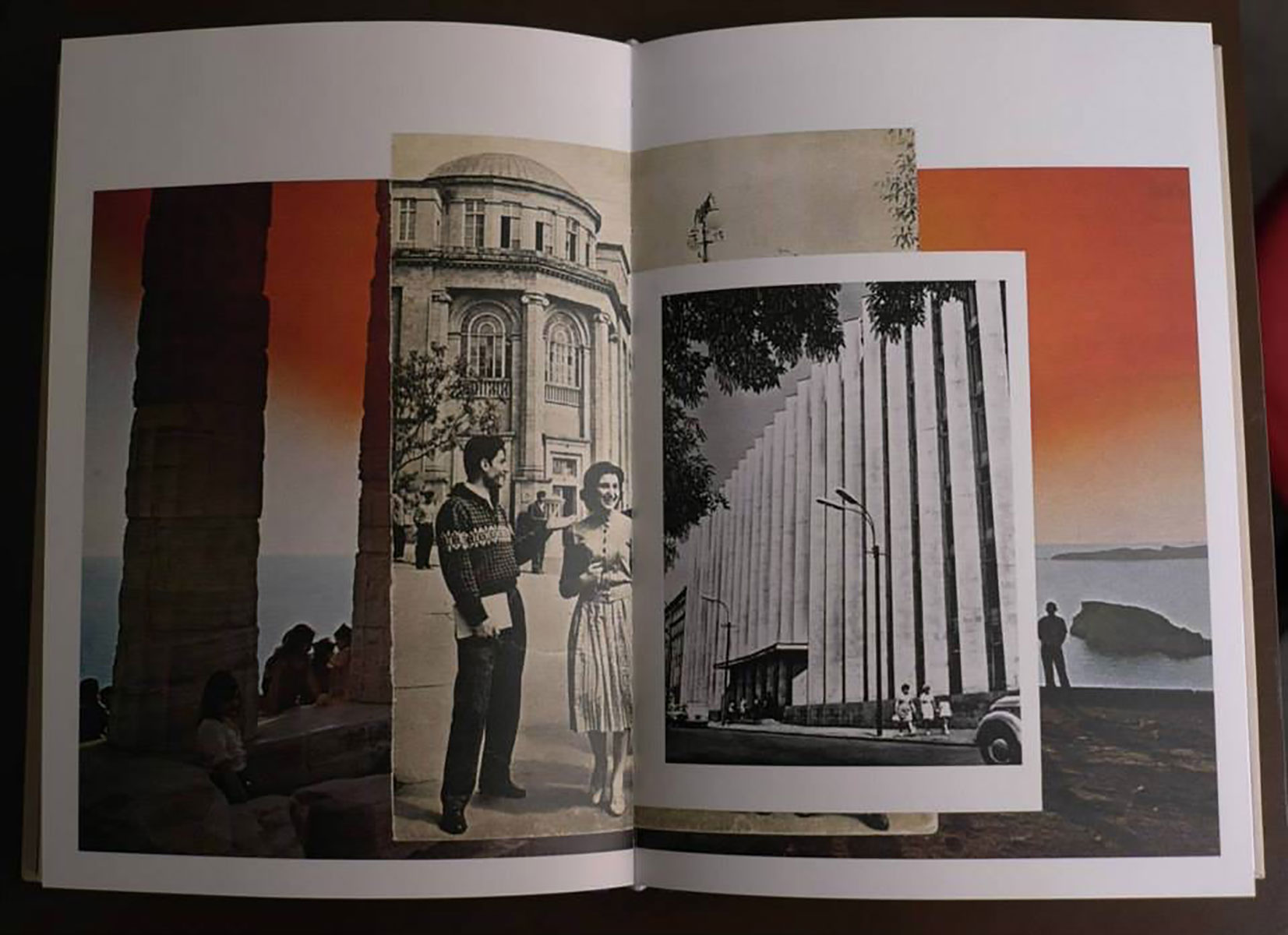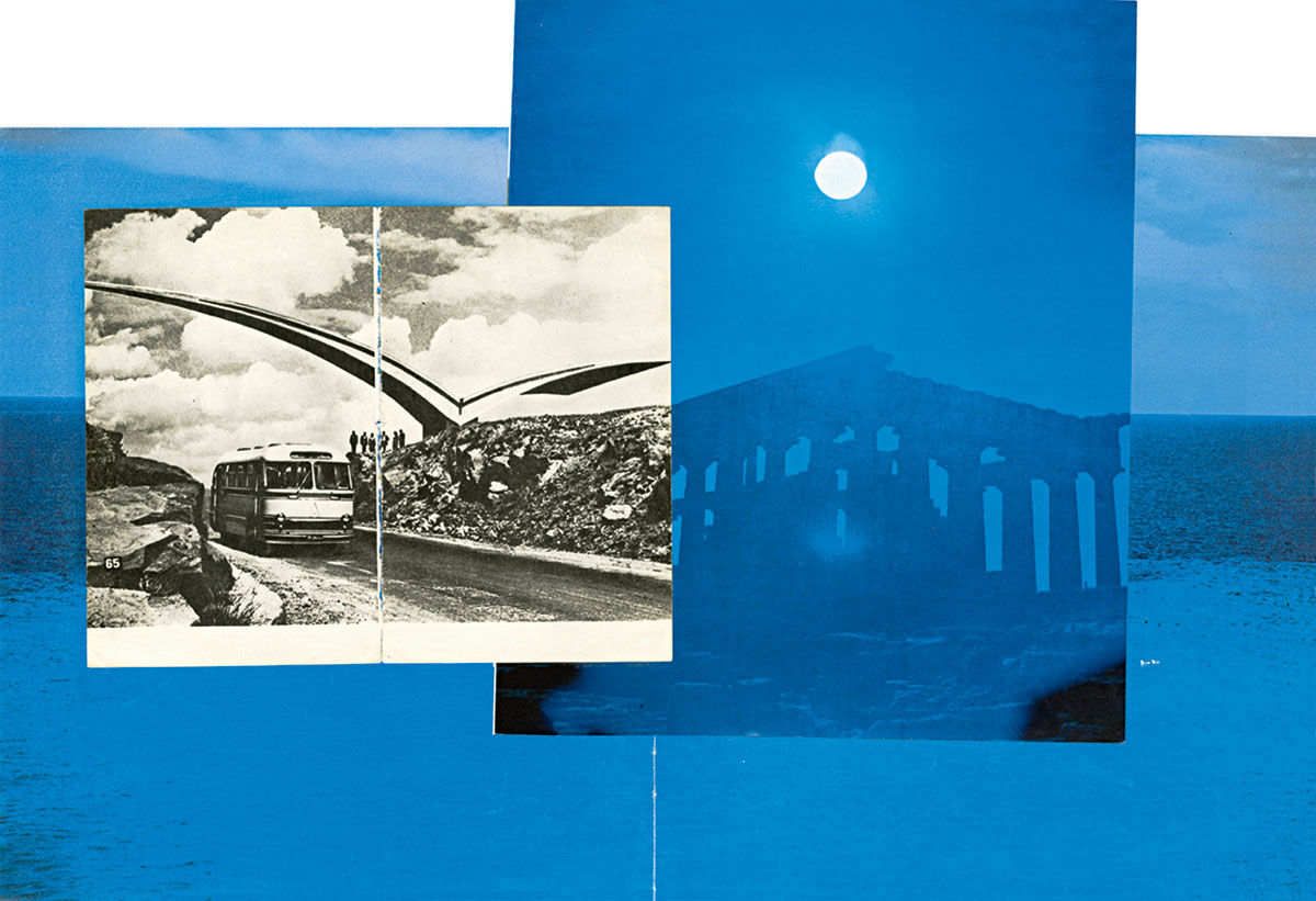 A Small Guide to the Invisible Seas is based on an extensive collection of photographic albums of Soviet Armenia, Turkey and Greece dating from the 1960s to the early 1980s, collected over a period of 4 years. The albums sometimes acting as documentation of changing landscapes and other times as tourist catalogues function as nation building mechanisms: they narrate through photography an image of each nation. A Small Guide to the Invisible Seas assembles these heterogeneous images produced in diverse geographical, ideological and historical contexts into a series of collages and an artist’s book that together construct a new landscape unearthing an invisible topography. The project offers a metaphysical and gendered reading of the nation building forces shaping the original material, a reading that both mimics narratives of cosmic inception (the birth of the nation) and echoes feminine and masculine metaphors (mother Armenia, the father of the nation). Divided into seven chapters that follow the logic of the Seven Seas (an idea used over centuries to describe a diverse set of geographical settings), the guide translates the narrative of genesis not as an evolutionary progression but as a circular and synchronous connection between bodies of water.