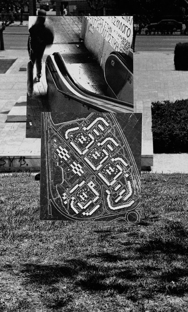 Exercises in Speaking Out, Volume 2 (Architecture), 2021 deals with relationships between utopic representations of modernist architecture drawn from Soviet and East German sources and photographs exposing the realities of social struggles in Greece during the 1990s.