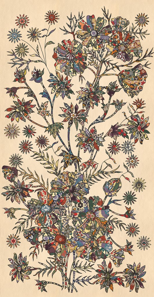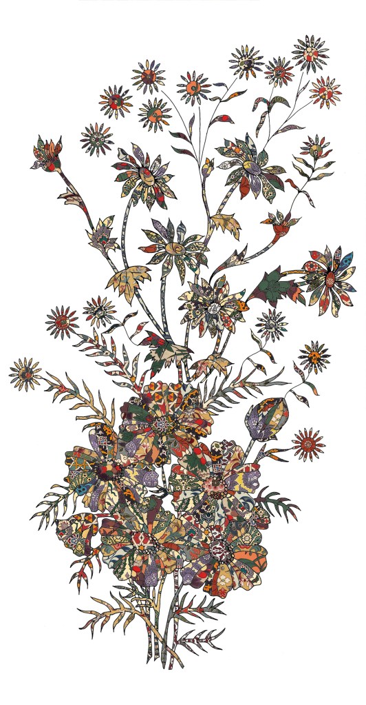 Forget-Me-Not is a series of digital photographic embroideries that construct a kaleidoscope of decorative flower motifs, drawing from a variety of sources: vintage flower embroidery pattern books, encyclopedias of ornamental design, and dictionaries of colour combinations. The project extends my ongoing interest in working with found images and employing collage as a strategy to bring diverse materials into dialogue. However, unlike previous works—which engaged with disparate image histories, specific political events, or locations—this project directly addresses vernacular cultural traditions and visual languages that predate the photographic.