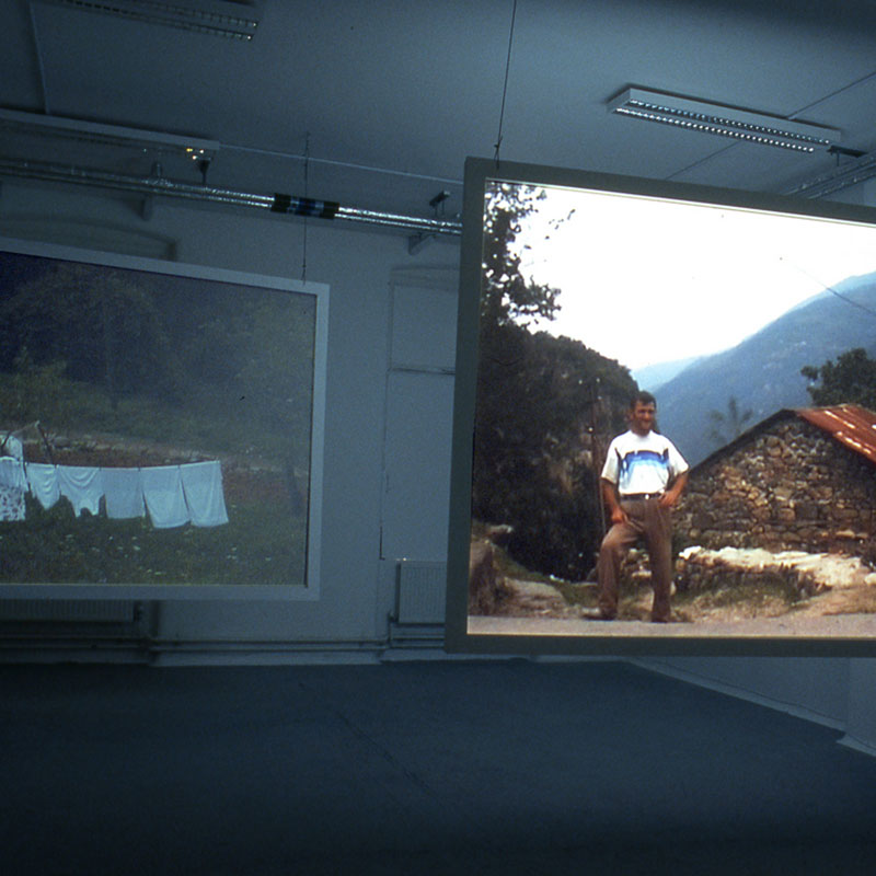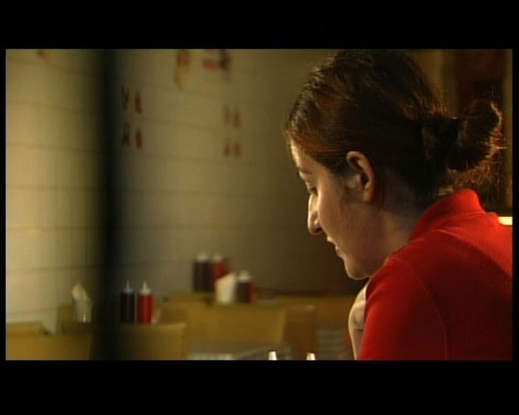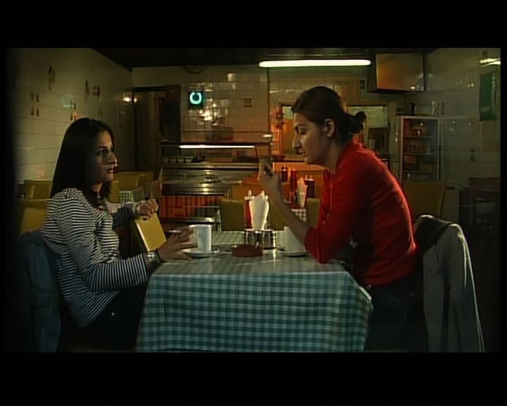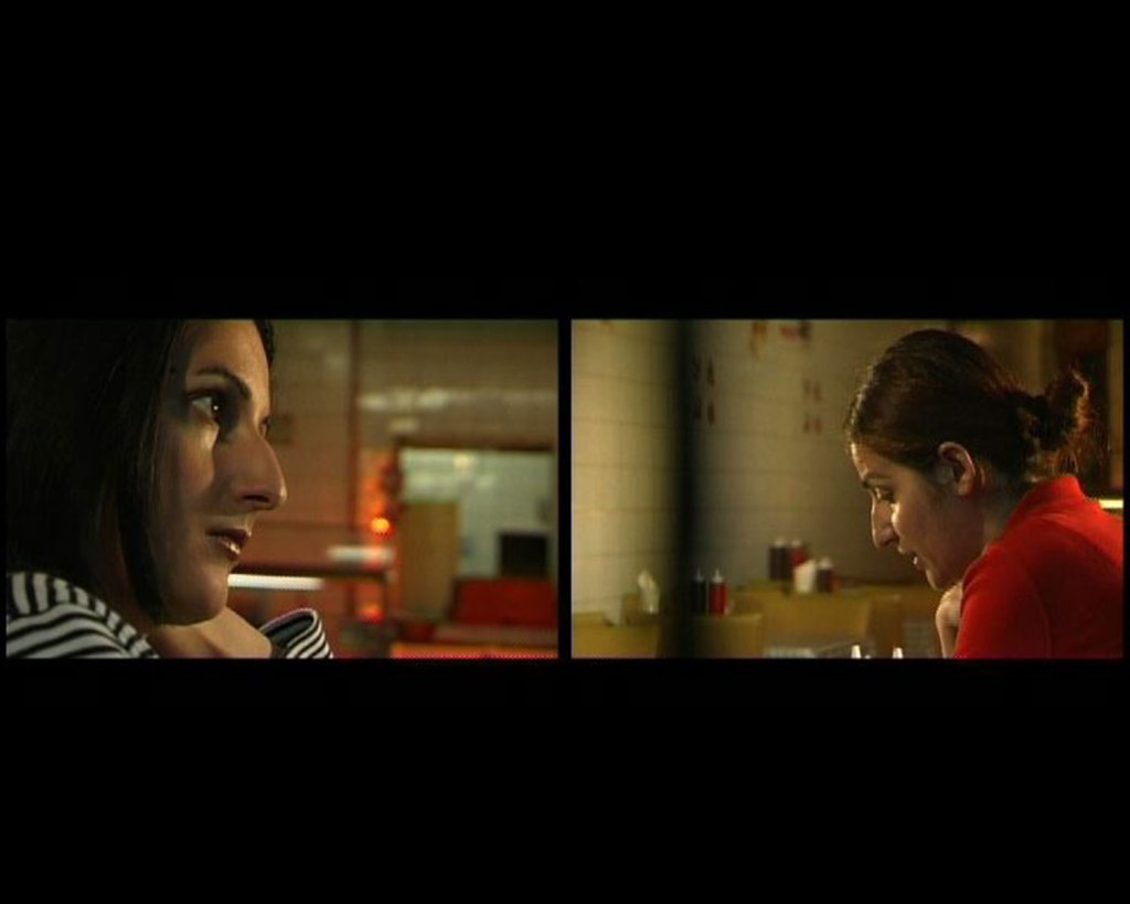 In their Wake is a two-screen digital audio-visual installation produced as a collaboration between Aikaterini Gegisian & Ella Bissett Johnson (the two artists met and started working together during their BA degree at the University of Brighton). It centres around two women, who sit in an empty café, overlooking a busy urban scene, for the duration of a day. The stillness of their immobility is broken into film fragments and weaved into a sequence that transforms the fragments into movement. The sound of an urban environment floods the space and surrounds the two women. The installation explores current issues of geographical, temporal and mental displacement within the metaphor of internal and external space. The viewer is caught in a perceptual game between real space, image and sound.
