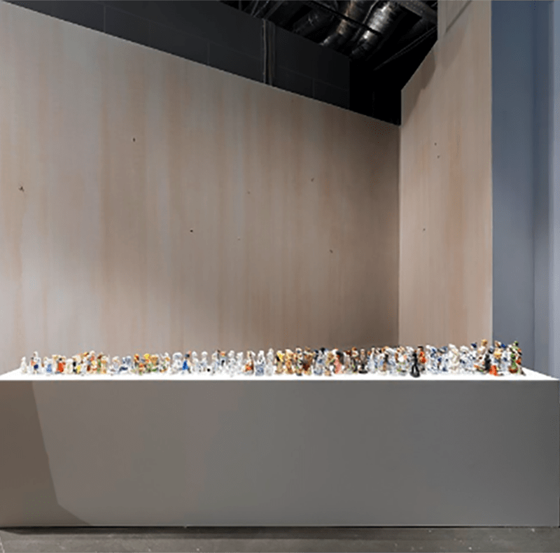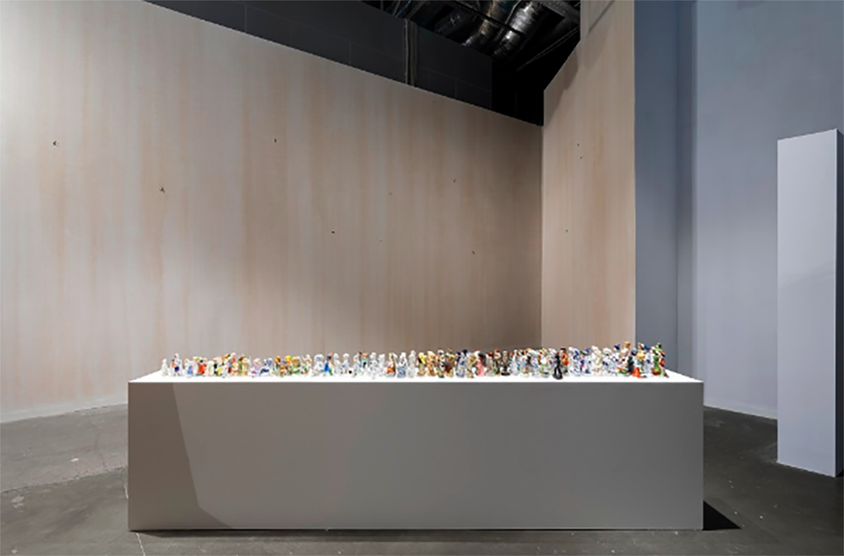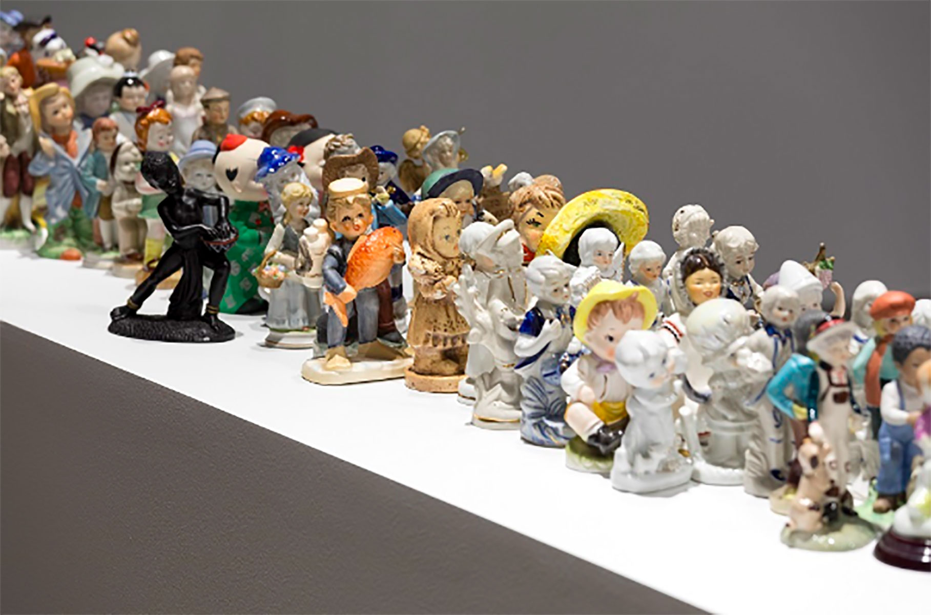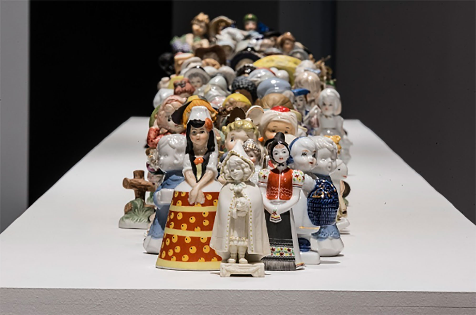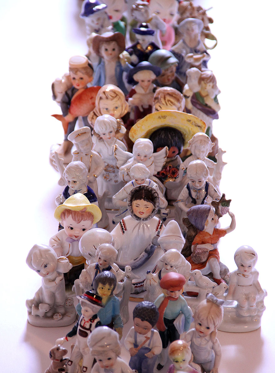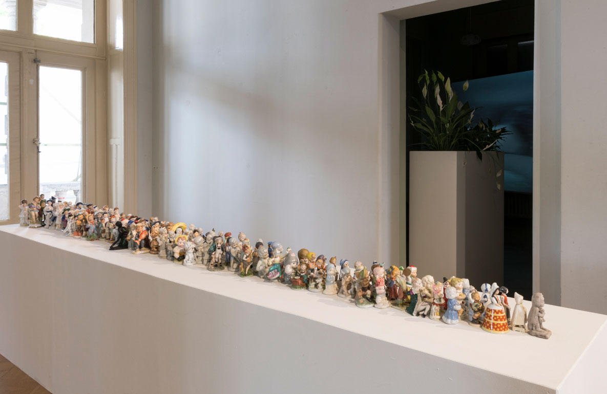 The Little Refugee consists of 125 found children figurines made of porcelain, clay, plaster and resin, sourced from various flea markets and the internet. Forming small family groupings based on height and posture, the disparate figurines are arranged into a straight line reminiscent of a march or a carnival parade. The work takes its name by a marble statuette of a boy with a dog, found in Gerontikon (Nyssa, Asia Minor) that dates back to 1st century B.C. Currently on display at the National Archeological Museum in Athens, the statuette is known as ‘The Little Refugee’ (to prosphyngaki), since according to the museum’s website ‘was brought to Athens by refugees in 1922’ (referencing the disastrous Greek Asia Minor war of 1922 that produced a wave of Greek refugees). Utilizing an ancient artefact as a metaphor (to reference historical conditions of the time of its excavation) points to how archeological objects have been implicated in national narratives but also establishes an analogy between an inanimate object and living humans. Following from this, The Little Refugee salvages an ‘incomplete’ collection of children figurines that cross historical and geographical contexts and moulds them into an ‘inappropriate’ collision of forms. Engaged in a symbolic archaeology, the work gives shape to a new collective body of a frequently voiceless minority and considers the cultural and ideological construction of both childhood and material culture. In Becoming a Refugee, small objects representing children, produced in a variety of styles and which are usually associated with collecting as a cultural pastime, become material evidence of the current historical moment in what is being described as ‘The European Refugee Crisis’.