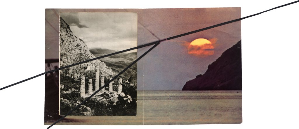 The Black Line is part of a trilogy of works (which includes The Red Line & The Blue Line) produced out of the same pool of images as A Small Guide to the Invisible Seas, sourced from Greek, Turkish and Soviet Armenian tourist catalogues, from the 60s to the 80s. Instead of weaving together the diverse found material in an invisible new topography, the trilogy questions the construction of national identities by exploring specific recurrent symbols associated with each of the nation states. Where A Small Guide to the Invisible Seas unearthed new topographies through gaps and layering of images, the new works abstract, they take over through lines and colours what has already been constructed. Referencing both the censorship line and the visual language of constructivism, the insertion of the line is also a humorous dismantling gesture.