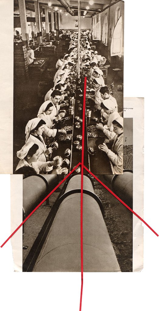 In The Red Line, images of the great Soviet industrial operation are piled up, forced into a single space, reinforcing that glorious moment of construction, only to be interrupted by that infuriating red line of abstraction that breaks up, interrupts any sense of ideological unity. It is the red line that cannot be crossed and at the same time the line (the ideology) of the Soviet state.