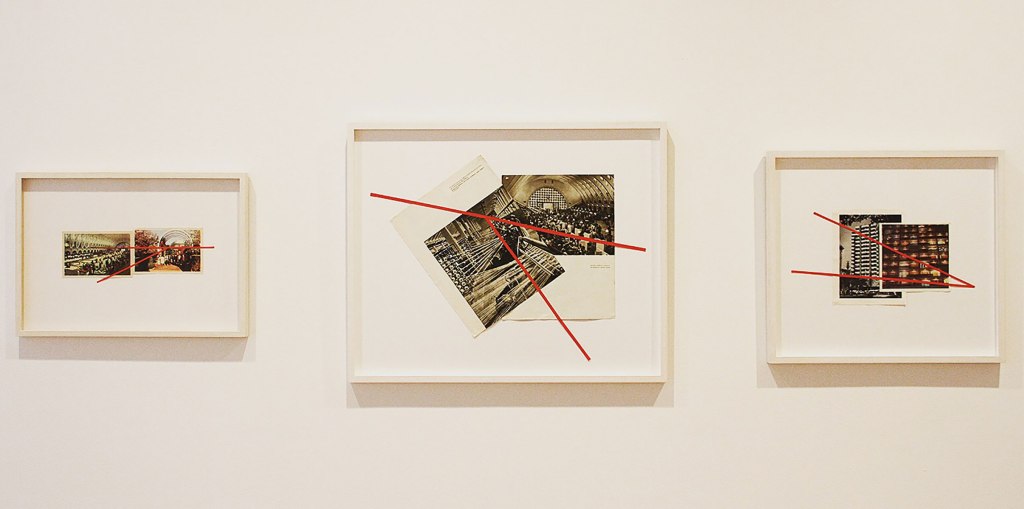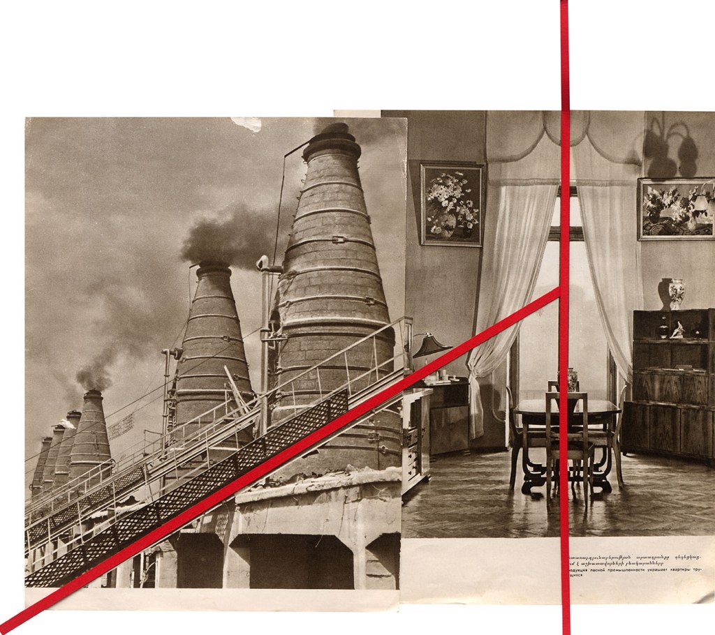 The Red Line is part of a trilogy of works (whichincludes The Blue Line & The Black Line) produced out of the same pool of images as A Small Guide to the Invisible Seas, sourced from Greek, Turkish and Soviet Armenian tourist catalogues, from the 60s to the 80s. Instead of weaving together the diverse found material in an invisible new topography, the trilogy questions the construction of national identities by exploring specific recurrent symbols associated with each of the nation states. Where A Small Guide to the Invisible Seas unearthed new topographies through gaps and layering of images, the new works abstract, take over through lines and colours what has already been constructed. Referencing both the censorship line and the visual language of constructivism, the insertion of the line is also a humorous dismantling gesture.