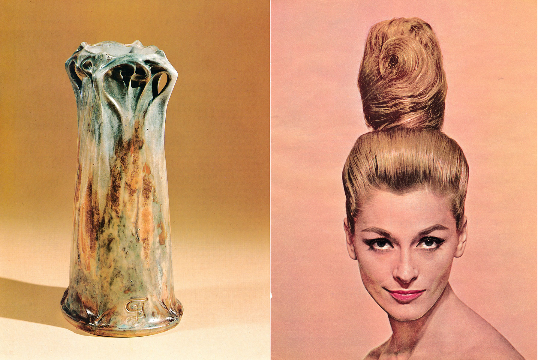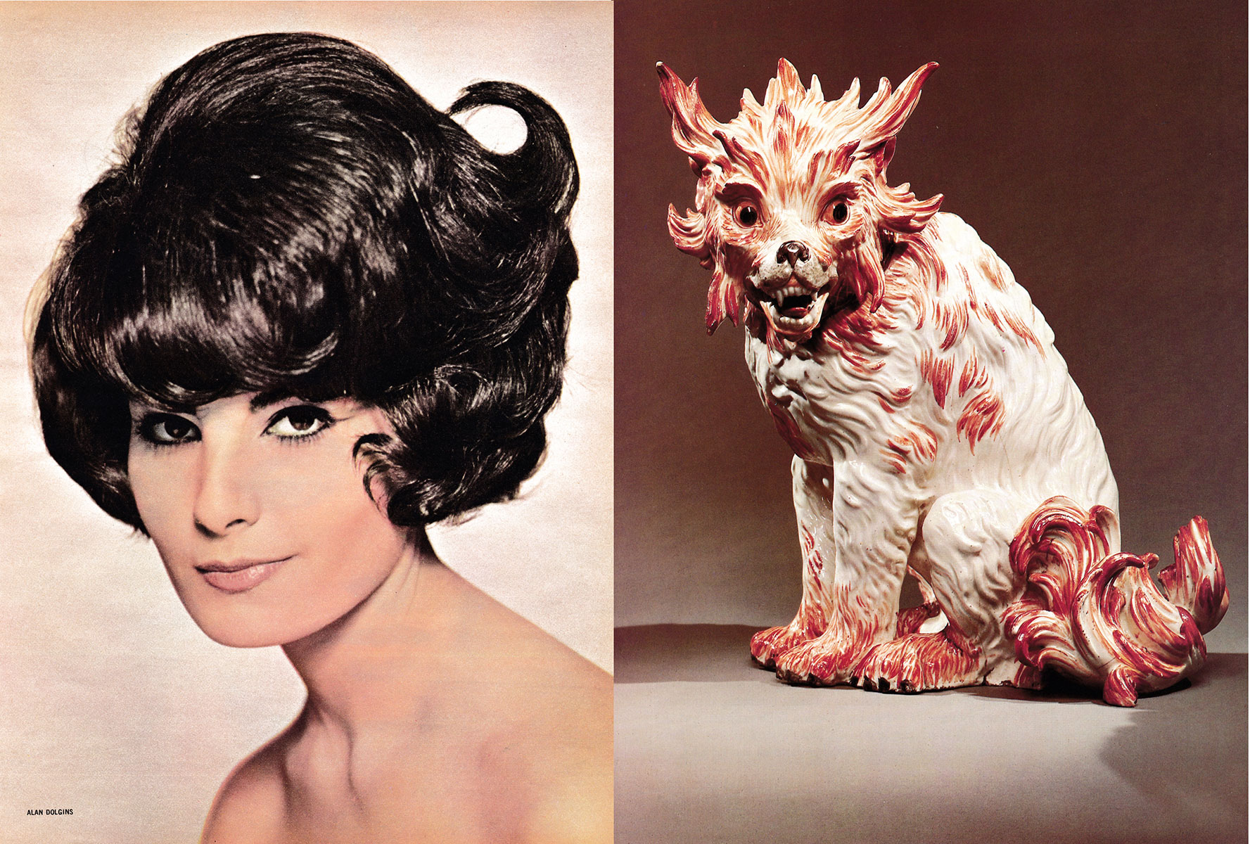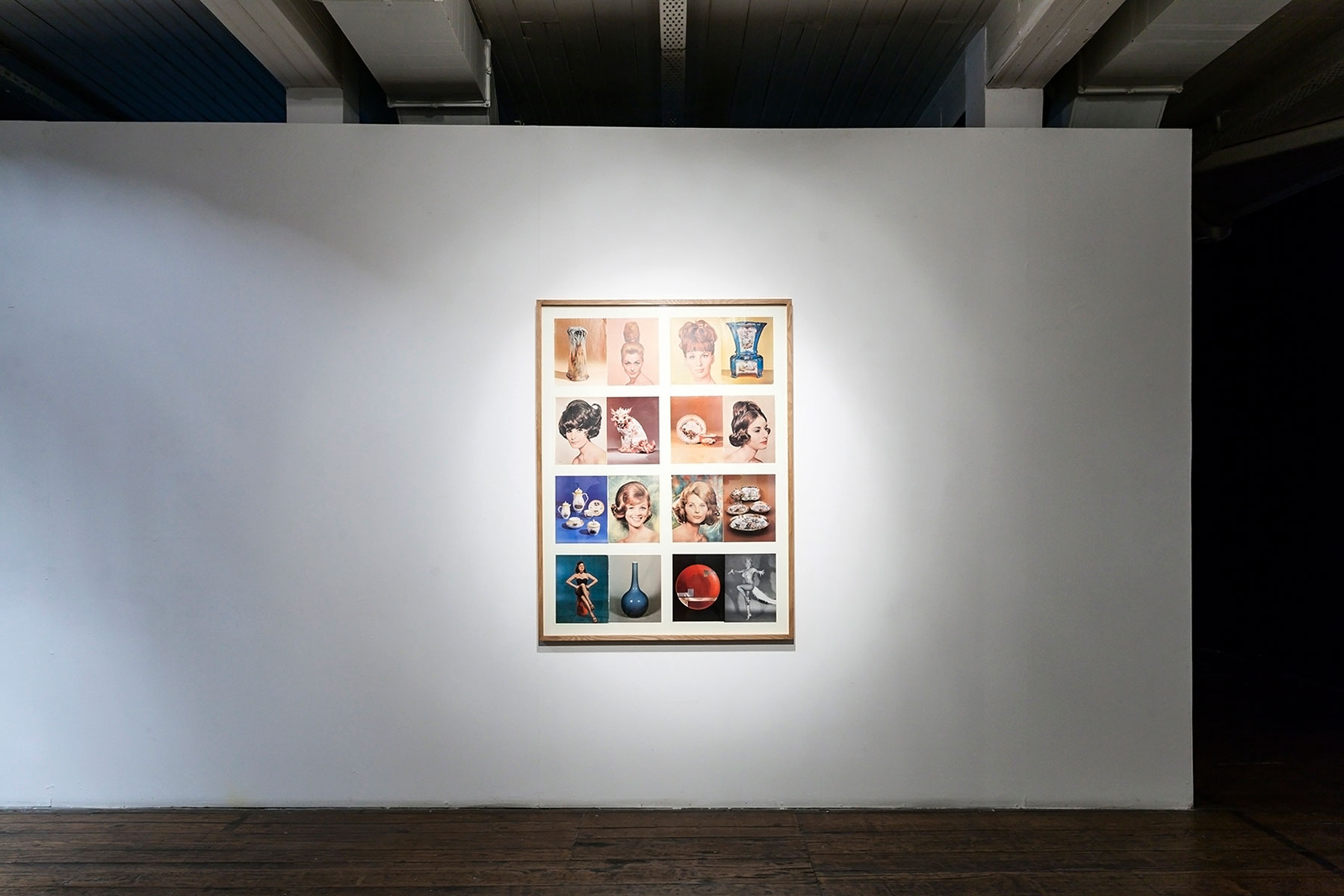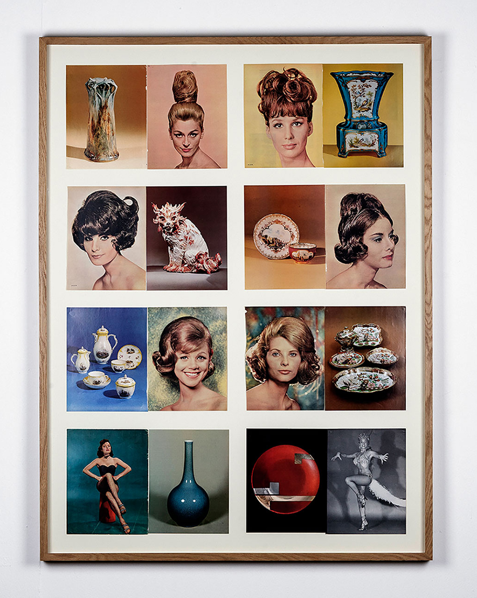 Pop archaeologies and female iconography take centre stage in The Split (2014), a photographic composition based on found images, gleaned from American popular hair magazines of the 60s and from the Smithsonian Illustrated Library of Antiques (Porcelain). Juxtaposing the seemingly unrelated cultural phenomena of hair fashion and museum objects, the work unites them as photographic images. Accepting gaps and interconnections to guide the images towards new associations, The Split questions both the limitation of portraiture and museological systems of organizing knowledge. The juxtaposition between disparate cultural phenomena and photographic images also reflects the bringing together of different artistic strategies, from the psychoanalytical in the surrealist imagination, to the excavation of the constructed nature of representation in conceptual methodology.