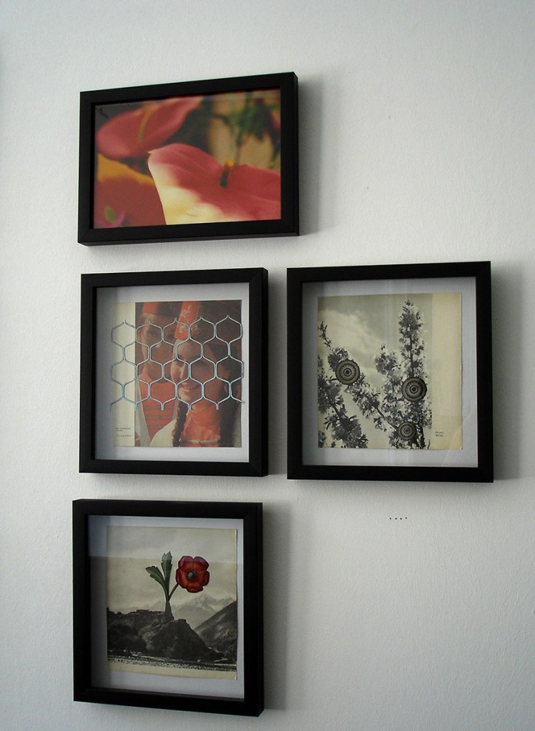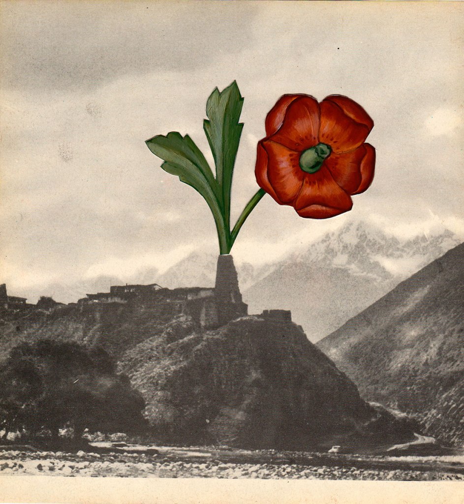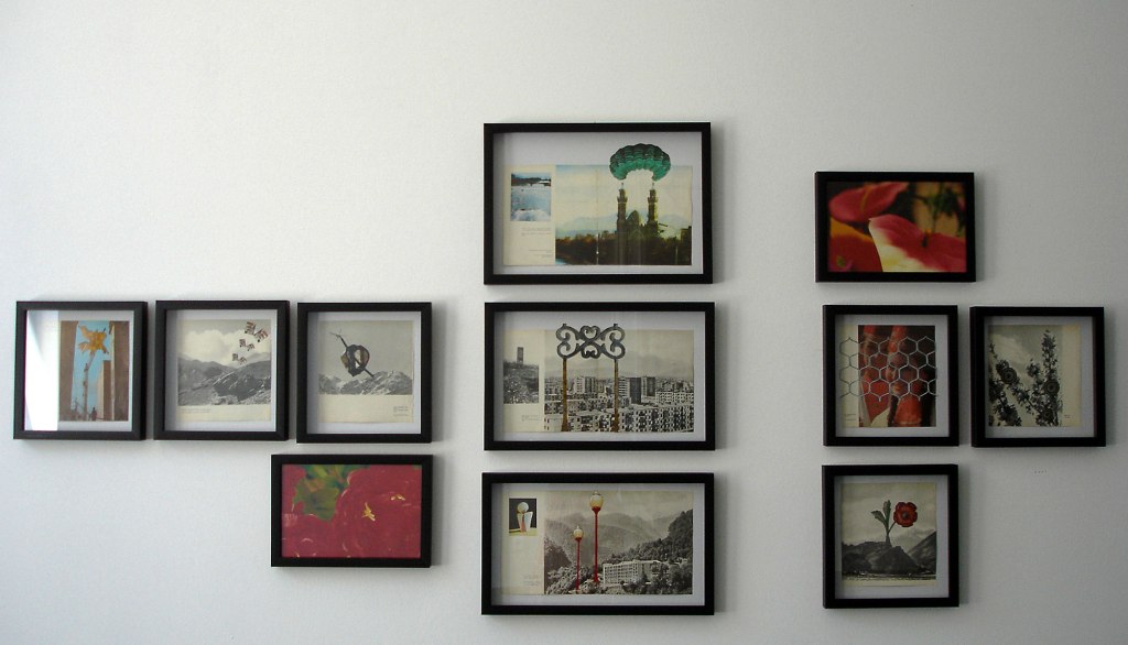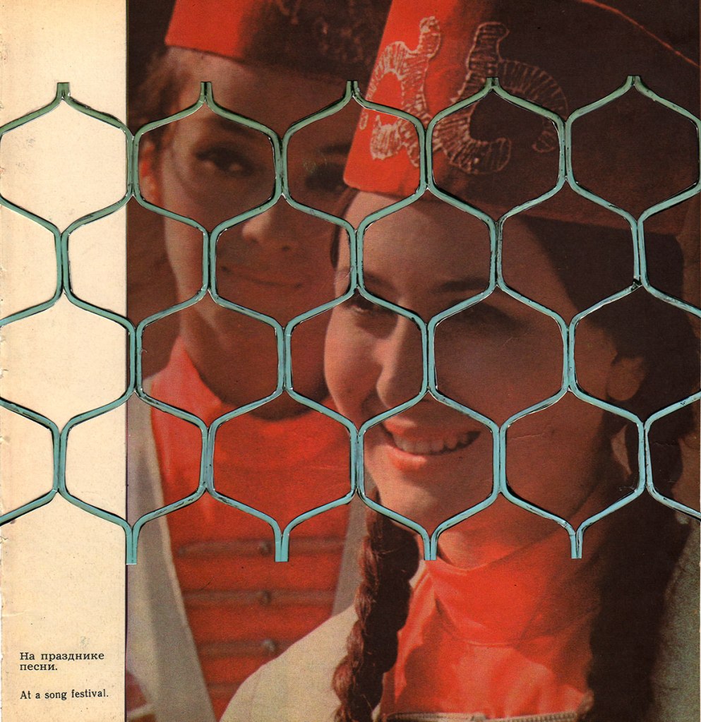 The Suspended Real is the result of archival research conducted in the national library of North Ossetia-Alania, for unearthing visual metaphors implicit in the construction of local national narratives. The outcome is a collage installation based on images of Soviet photo albums, which are juxtaposed with my own photographs of decorative patterns and street furniture in Vladikavkaz. The archival images serve as a canvas for going back to a medieval visual imaginary, while the collaging maps them into the current public spaces of the city. A sense of unreality is cultivated through the metaphor of suspension and the use of the ironic, the surreal and the absurd. Re-decorating images of the past domesticates the image, revealing a female subjectivity and the possibility of transformation inherent in the ‘others’ point-of-view.