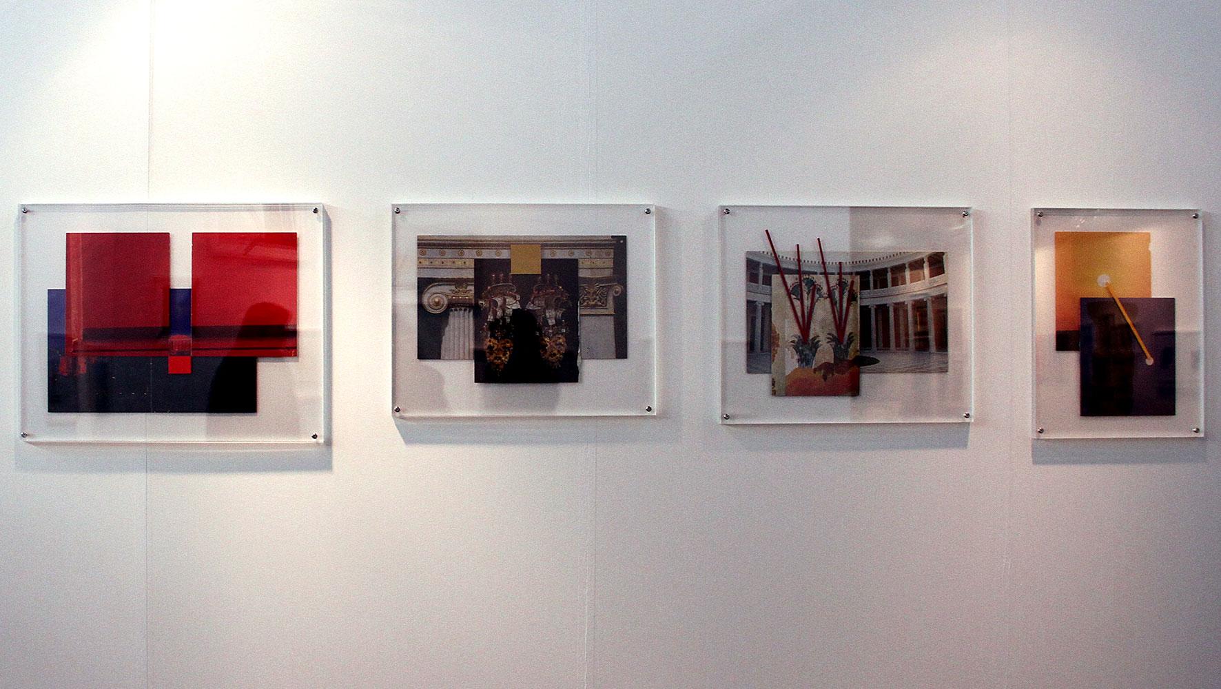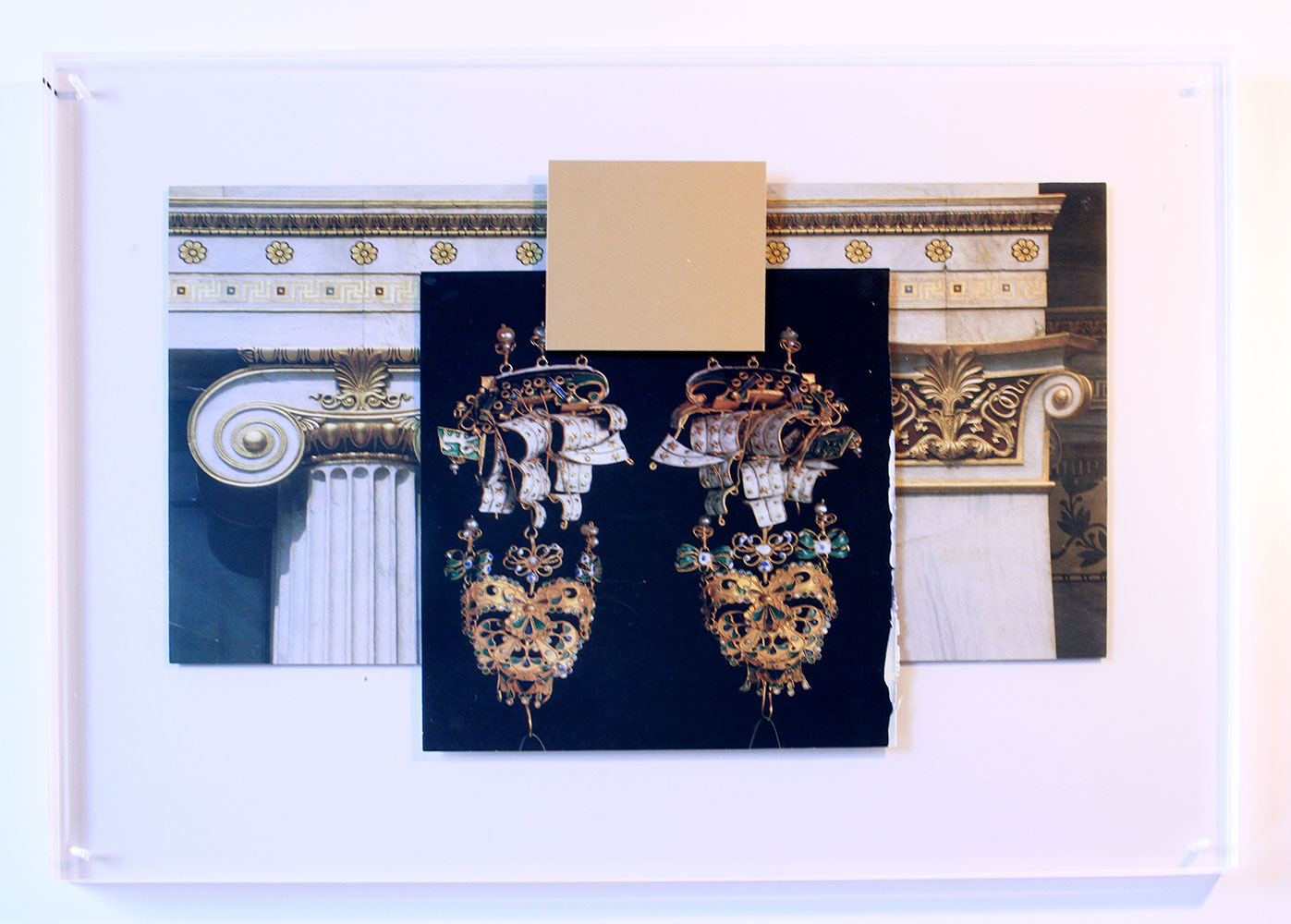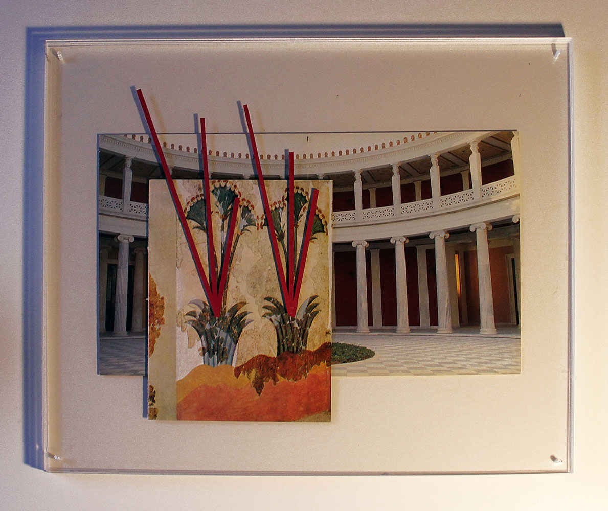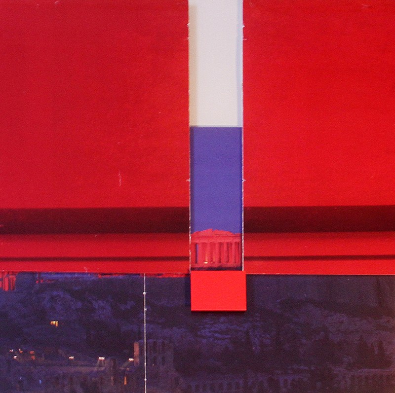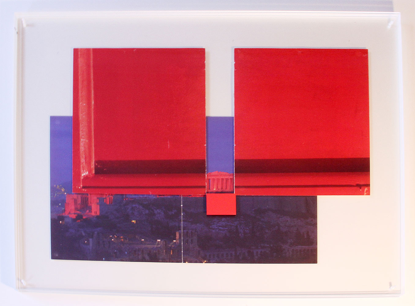 Through the Looking Glass is based on archival images sourced from tourist catalogues produced by GNTO (Greek National Tourist Organisation) between 1972 and 1988. It continues the artist’s exploration of the timeless imagery of Greece as a modern tourist paradise by focusing on the use of colour and geometric form. Gegisian’s investigation of tourism as a mechanism of representation moves from ancient monuments and the sun, to also encompass a series of other visual references, such as modern Greek neoclassical architecture and folk design. In the interplay between architectural space and close-up of colour details, the work resists the flat surface of the photographic, expanding the notion of collage into a spatial layering, in an attempt to literary see through the image. Marking a turn towards a playful questioning of the role of visual languages in the construction of ideology and nationhood, the works also represent a shift in Gegisian’s practice from collage on paper to the exploration of the spatial properties of photography and collage.