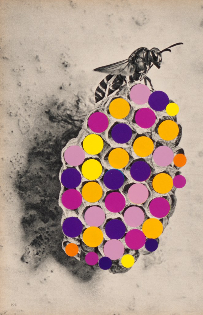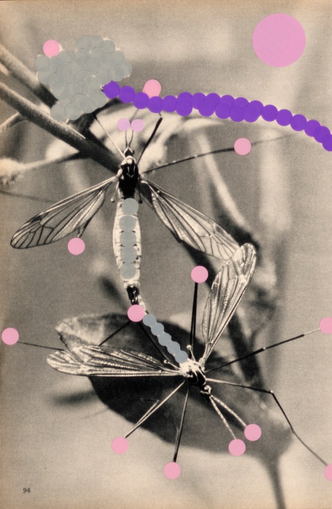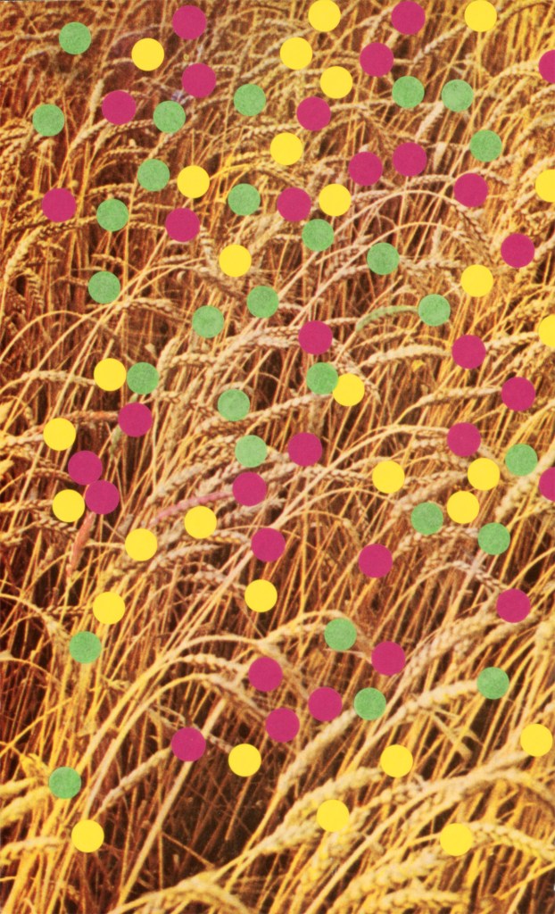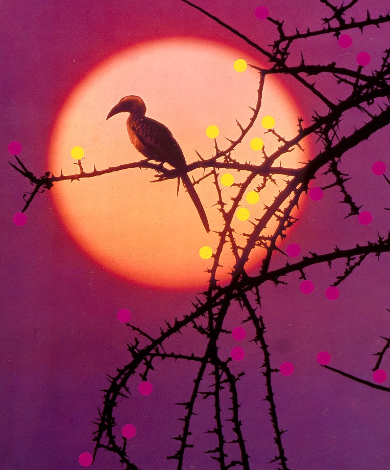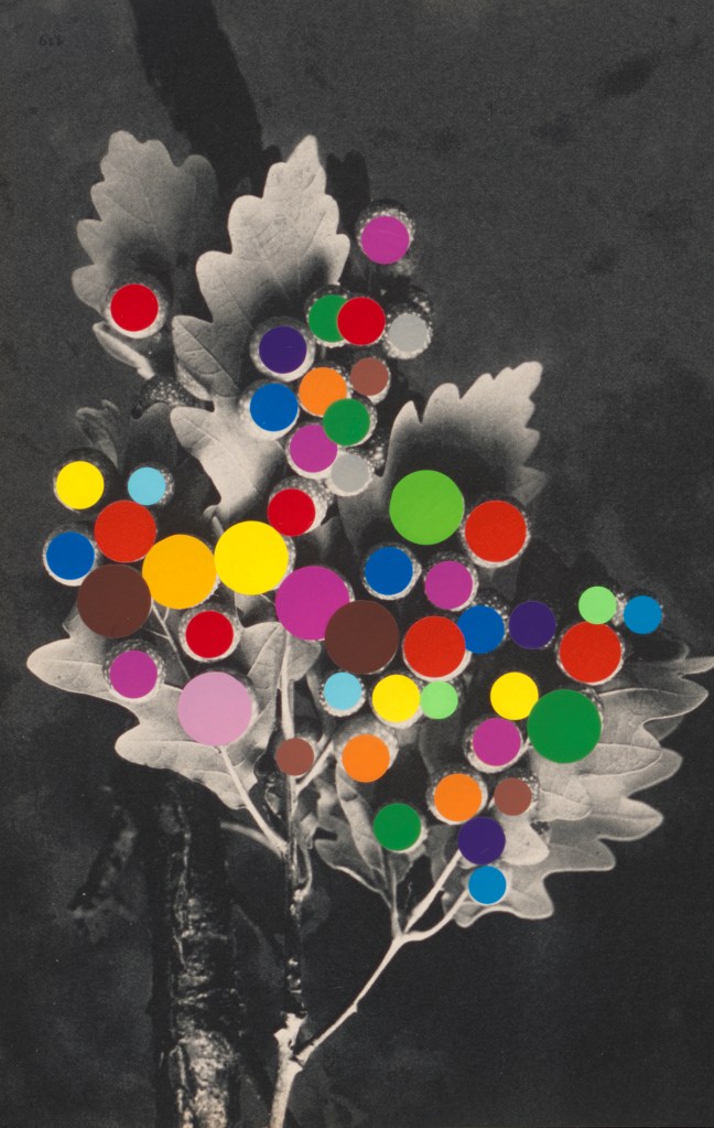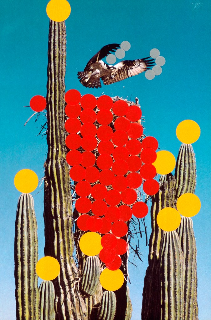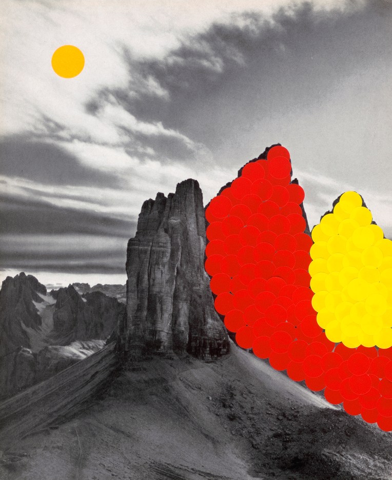 What happens if we only see in circles? is a collage series that interrogates vision, nature, and the photographic medium itself—using adhesive dots to rework found images of animals, wildlife, and mountainous landscapes. Sourced from disparate archives of landscape and wildlife photography, these images are reconfigured through the meticulous application of adhesive dots, then enlarged into expansive inkjet prints on various surfaces, ranging from paper, vinyl, and textiles. The series engages with photography’s expanded field, probing its dual histories: the early Romantic belief in the medium’s capacity to capture the unseen (spirits and auras) and its later instrumentalization as a tool of scientific mastery, enforcing a regime of visibility that sought to categorize and dominate nature. By collaging these images with the circular intervention of the adhesive dots —a gesture both playful and disruptive—the project undermines photography’s claim to objective representation. The dots act either as colour glitches, or as outlining mechanisms, in both cases reframing the image.